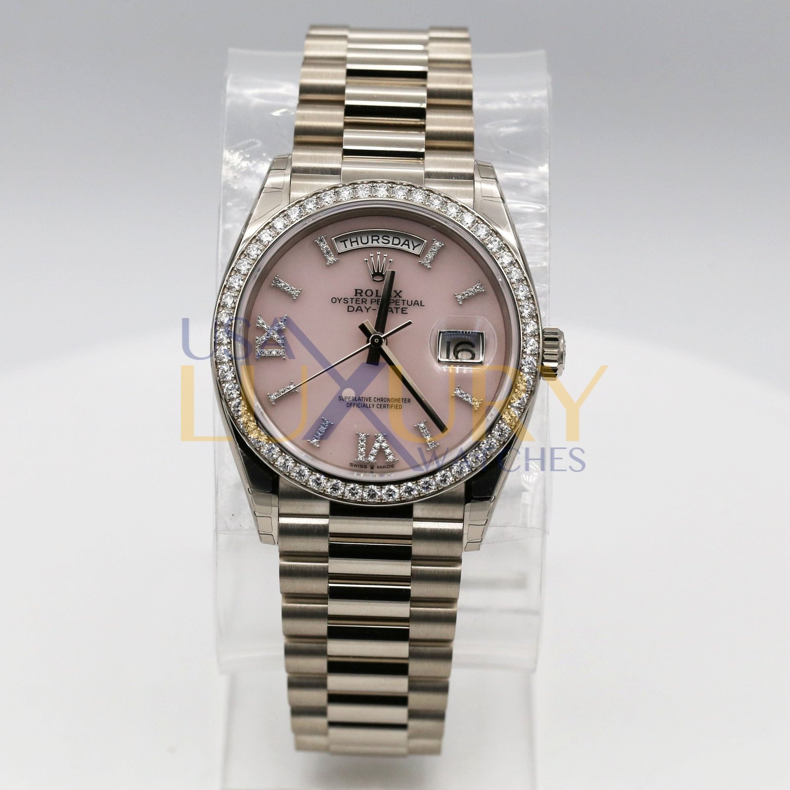 Rolex Day-Date 128239 18K White Gold President Diamond Bezel Pink Opal Diamond Dial