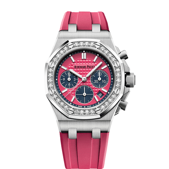 Green dial with “Lady Tapisserie” pattern, blue counters, blue external zone, white gold applied hour-markers and Royal Oak hands with luminescent coating.