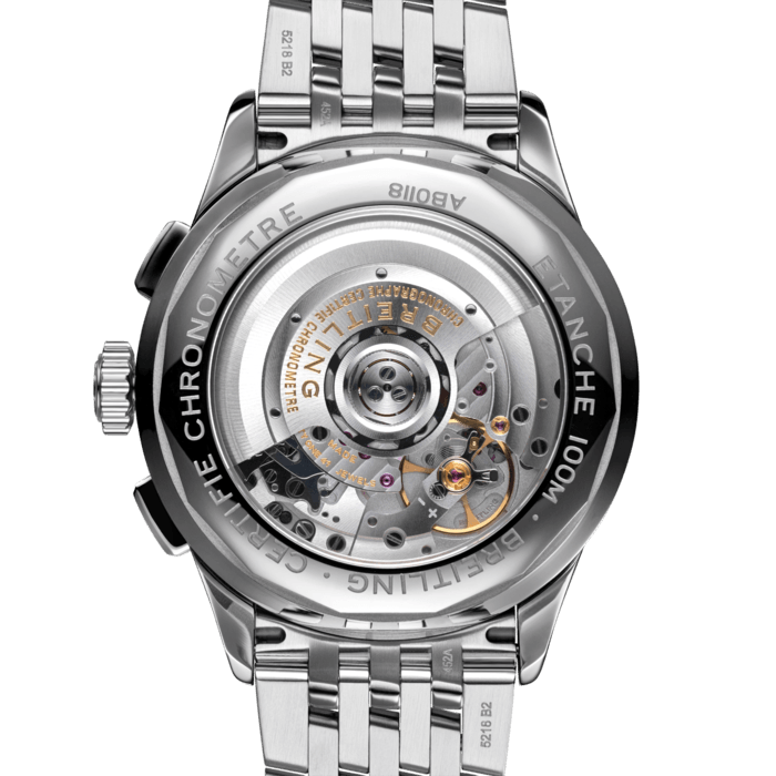 Non-screw-locked, two gaskets. Cambered sapphire, glare-proofed both sides. The Fixed silver-tone Stainless Steel bezel. Breitling in-house caliber B01 contains 47 jewels & has an approximate power reserve of 70 hours. The watch presented on a Polished Stainless Steel Navitimer Bracelet with Push Button Folding Clasp.